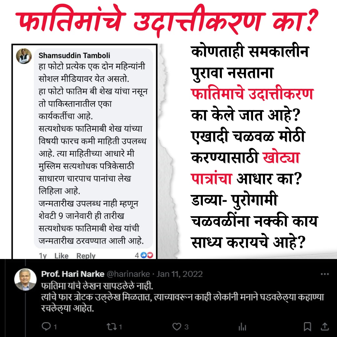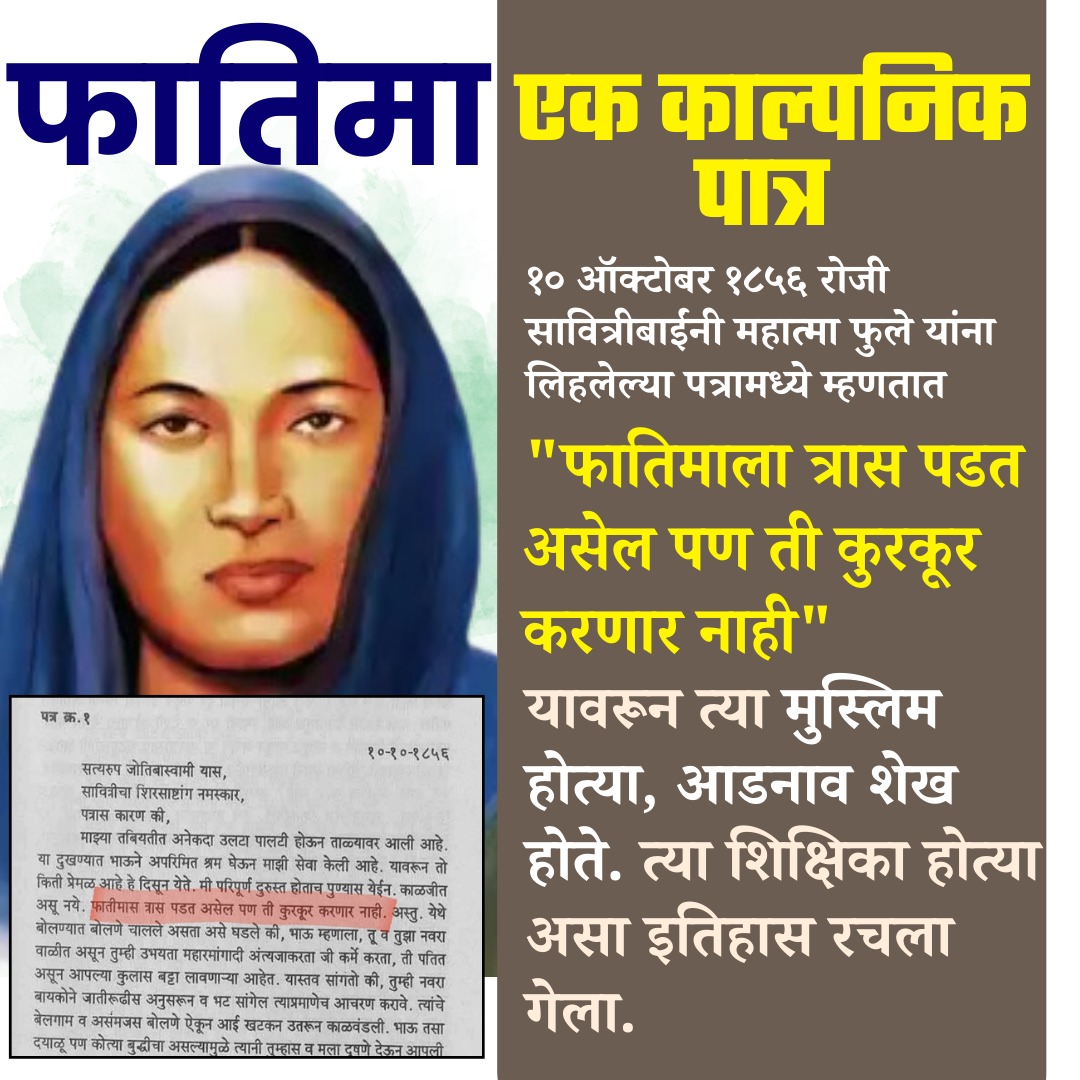 ज्ञानज्योती सावित्रीबाई फुले यांच्या पत्रातील एका ओळीचा आधार घेत ‘फातिमा शेख’ या कथित पहिल्या मुस्लिम शिक्षिकेचे चरित्रच उभे करण्यात आले आहे. ज्याला कुठलाही समकालीन ऐतिहासिक संदर्भ नाही. मात्र, त्यावर देशभरात चळवळ उभी करण्यात आली असून, समाजाचे संघटन करण्या ऐवजी समाजात फूट पाडण्याचे काम करण्यात येत आहे.