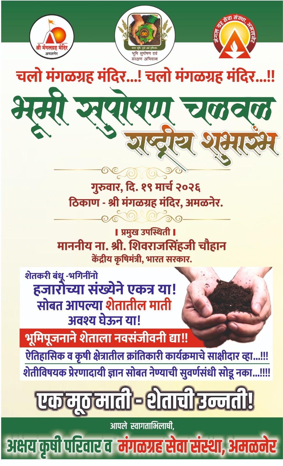 अमळनेर| ‘भूमी स्वस्थ तर समाज स्वस्थ’ या संकल्पनेवर आधारित ‘भूमी सुपोषण व संरक्षण अभियान’ हे अभियान अमळनेर येथील मंगळग्रह मंदिर परिसरात राबविण्यात येणार आहे. या कार्यक्रमासाठी केंद्रीय कृषिमंत्री शिवराज सिंह चौहान व राष्ट्रीय स्वयंसेवक संघाचे अखिल भारतीय कार्यकारिणी सदस्य व्ही. भागैय्याजी उपस्थित राहणार आहे. शेती, मातीचे आरोग्य, नैसर्गिक शेती, तंत्रज्ञानाचा वापर आणि शाश्वत कृषीपद्धती या विषयांवर व्यापक संवाद होणार असून देशभरातून सुमारे ५ हजार कृषीप्रेमी उपस्थित राहणार आहेत.