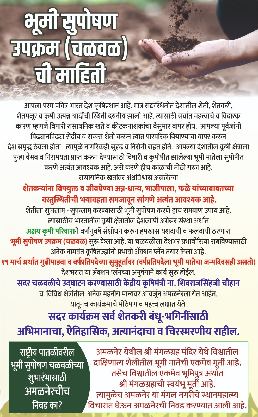 यावेळी रासायनिक शेतीचे दुष्परिणाम लक्षात घेता मातीचे पोषण, बियाण्यांपासून शेती पद्धतीपर्यंत नव्याने विचार करण्याची गरज तसेच, प्रशासन, सामाजिक संघटना आणि शेतकरी यांचा सक्रिय सहभाग या अभियानाला व्यापक चळवळीचे रूप देईल असा विश्वास व्यक्त करण्यात येत आहे. अमळनेरच्या मंगळग्रह मंदिर या कार्याक्रमचे आयोजन करत आहे.