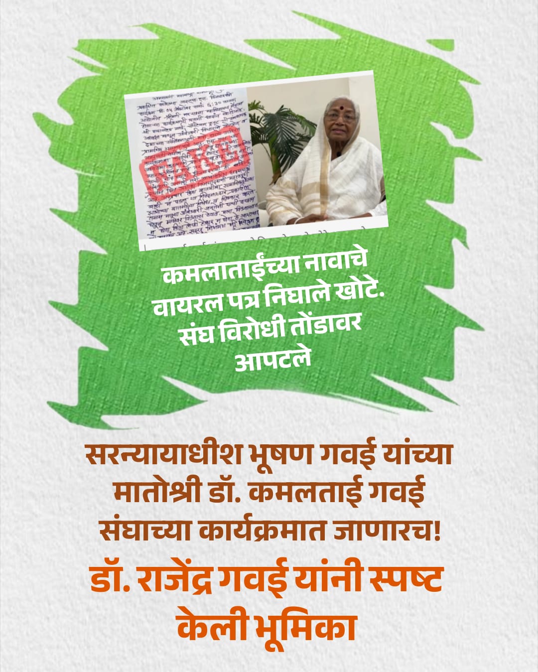 आदरणीय कमलताई गवई संघ उत्सवात जाणार नसल्याचे खोटे पत्र प्रसारित करणारी यंत्रणा ही लोकशाही विरोधी यंत्रणा आहे. त्यांच्या भावनिक षड्यंत्रांना आंबेडकरी समुदायाने बळी पडू नये कारण ही लोकशाही विरोधी यंत्रणा देश उध्वस्त करण्याचे स्वप्न बाळगून आहे. कारण त्यांना माहीत आहे की हिंदू आणि बौद्ध हे प्रखर राष्ट्रभक्त समाज आहेत आणि हे जर एकत्र आले तर त्यांचे देश उध्वस्त करण्याचे स्वप्न कधीच पूर्ण होणार नाही.