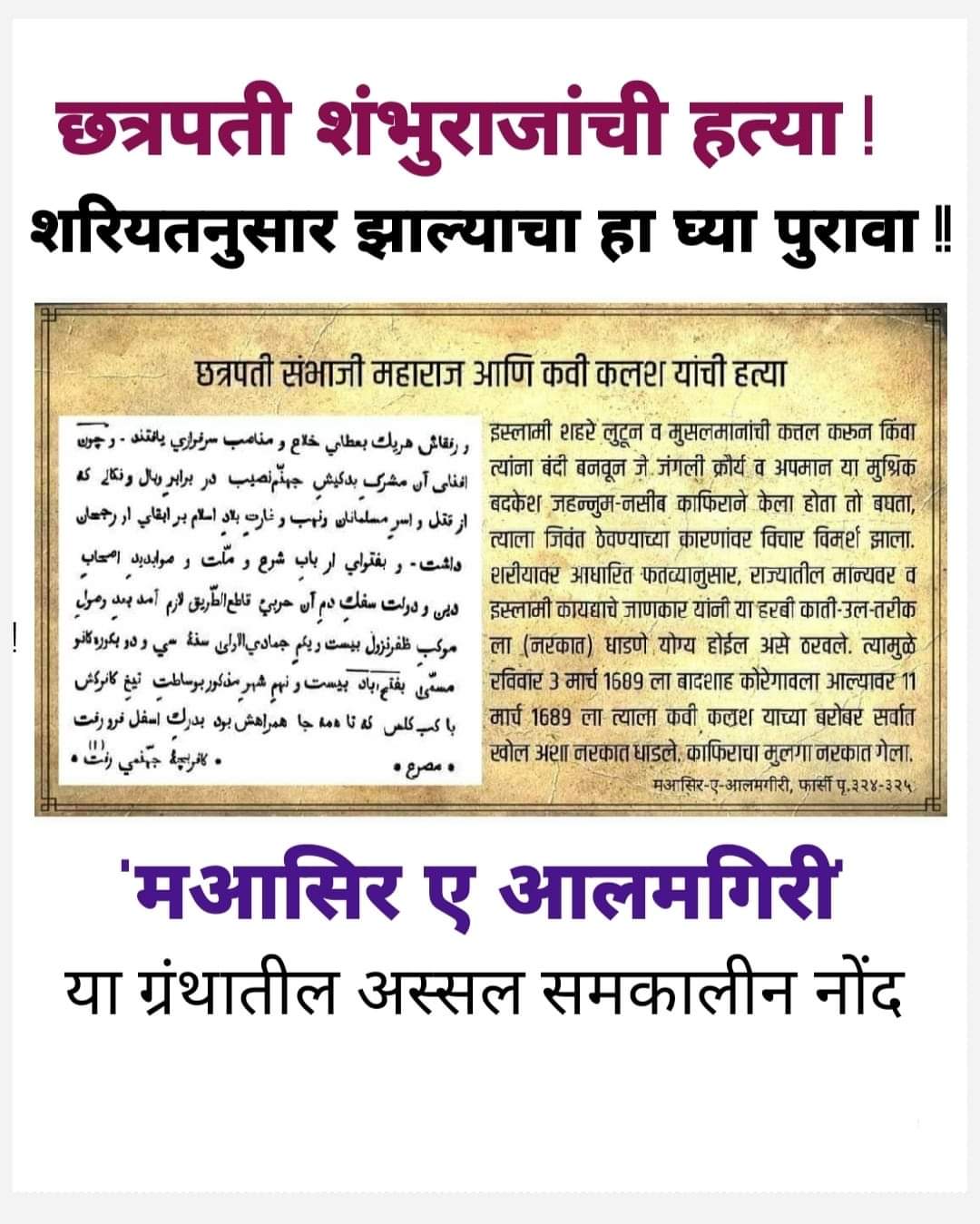 छत्रपति शंभुराजांना मृत्युदंड द्यावा असे औरंगजेबाच्या मनात होतेच पण हा *इस्लामिक जिहाद* असल्यामुळे मुस्लिम धर्मगुरुंच्या आदेशानेच तो हा दंड देऊ इच्छित होता औरंगजेबाने सर्व मुस्लिम धर्मगुरुंना बोलावून "या संभाजीने अनेक मुसलमानांना ठार मारले आहे तसेच इस्लामच्या राजवटीतील शहरे उध्वस्त केली आहेत तेव्हा काफीरास मृत्यूदंड द्यावा,अशी सुचना केली. यावर लगेच मुस्लिम काजी आणि मुफ्तींनी शंभुराजांच्या हत्येचा फतवा जारी केला" याची नोंद औरंगजेबाच्या दरबारी असलेल्या साकी मुस्तेदखानाने लिहिलेल्या "मआसिर ए आलमगिरी" या ग्रंथात केलेली आहे.