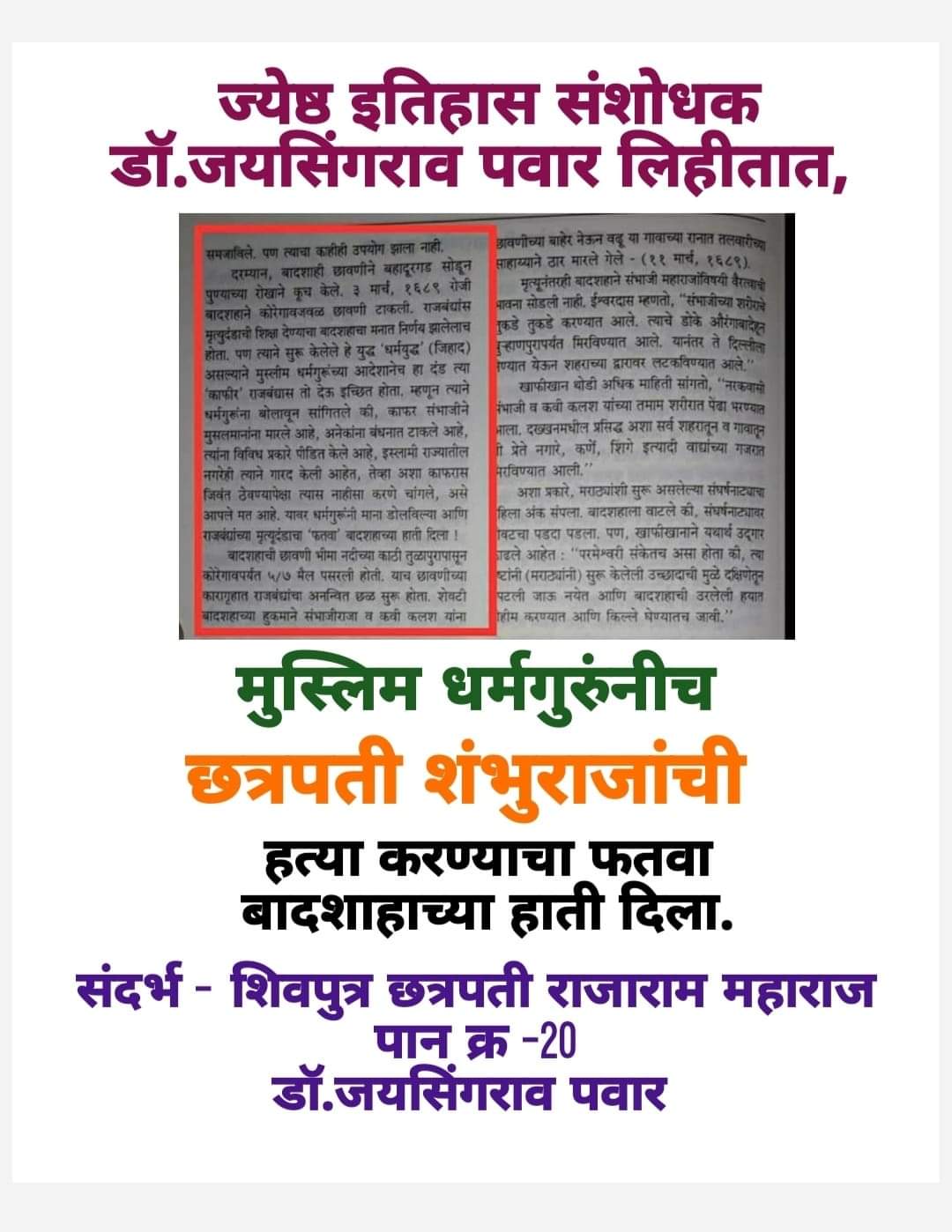 महाराष्ट्रातील इतिहास संशोधक डाॅ.जयसिंगराव पवार यांनी लिहिलेल्या "शिवपुत्र राजाराम" या ग्रंथातही पान क्र-20 वर "छत्रपति शंभुराजांची हत्या मुस्लिम धर्मगुरुंच्या फतव्यानेच झाल्याचे" स्पष्ट लिहिले आहे.